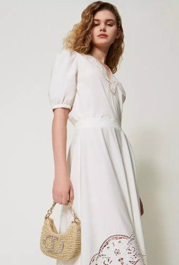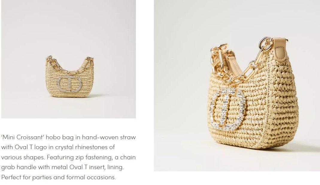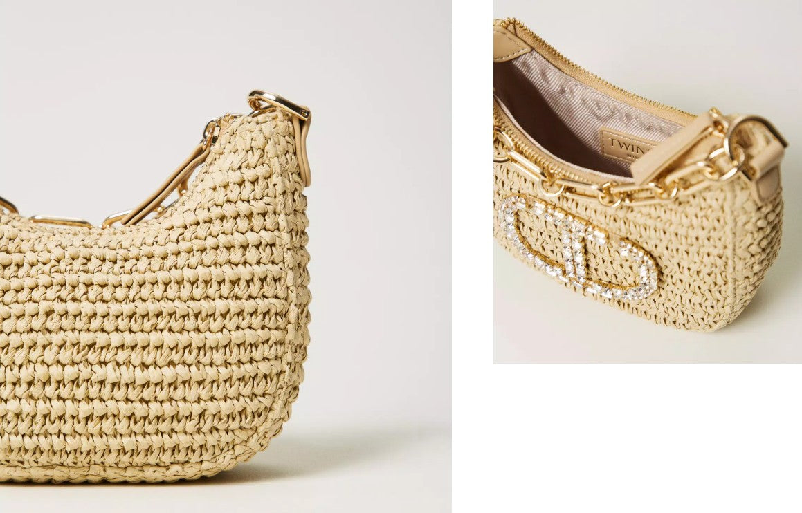 Mini Croissant Hobo bag in hand-woven straw with Oval T logo in crystal rhinestones of various shapes. Featuring zip fastening, a chain grab handle with metal Oval T insert, lining. Perfect for parties and formal occasions