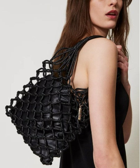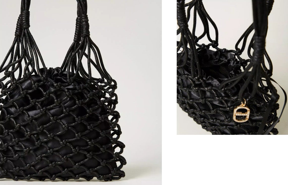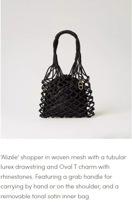 Alizee bag in woven mesh with a tubular lurex drawstring and Oval T charm with rhinestones. Featuring a grab handle for carrying by hand or on the shoulder, and a removable tonal satin inner bag