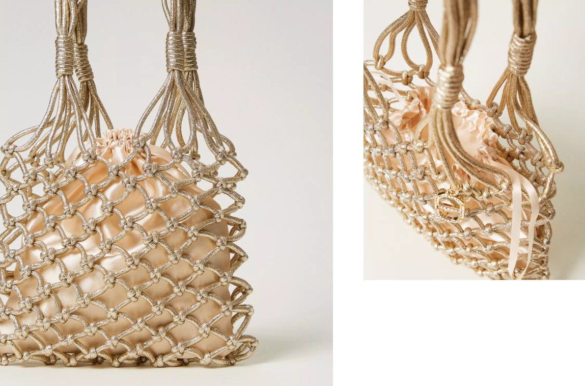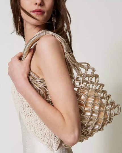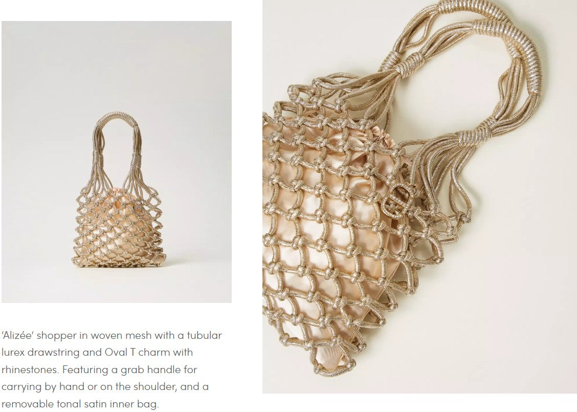 Alizee bag in woven mesh with a tubular lurex drawstring and Oval T charm with rhinestones. Featuring a grab handle for carrying by hand or on the shoulder, and a removable tonal satin inner bag